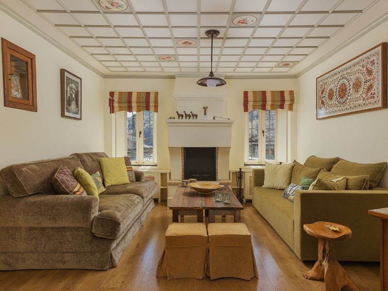 On the ground floor you will find the lobby, the living room with a fireplace, the kitchen with a dining area, a very small maid's room with its bathroom and a bedroom with two single beds and a bathroom with a small shower.